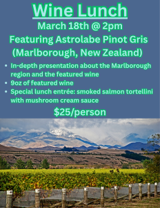 Lunch event featuring Astrolabe Pinot Gris (Marlborough, New Zealand). Includes an in-depth presentation discussing the wine and the Marlborough region, 9 oz. of the featured wine, and a special lunch entrée. See flyer for details.